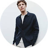 Man wearing navy suit and beige top