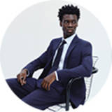 Man wearing navy suit and tie and black top