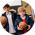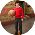 Boy wearing white shirt, grey shorts, black shoes and blue jumper and socks