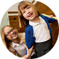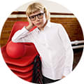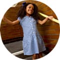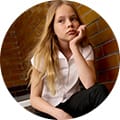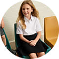 Girl wearing white blouse, red cardigan and grey skirt and tights