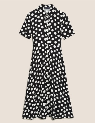 Bold polka dots and a smart shirt silhouette combine in this statement-making dress. It's cut in our comfortable regular fit, with gentle shaping at the waist and a flowy midi-length skirt. We've added a collared neckline, button-through front and short sleeves for a neat finish. M&S Collection: easy-to-wear wardrobe staples that combine classic and contemporary styles.